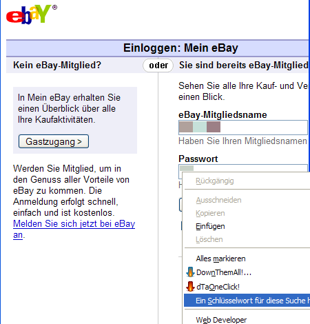Möchte man sich auf eBay einloggen um dort in "Mein eBay" mal schnell etwas nachzusehen geht man meist zu ebay.de, danach auf den Link "Mein eBay", dann wird man nach Username und Passwort gefragt und anschließend muss man dies bestätigen um dann zum Ziel zu gelangen. Einfacher geht's allerdings mit der eingebauten Schlüsselwortsuche von Firefox: